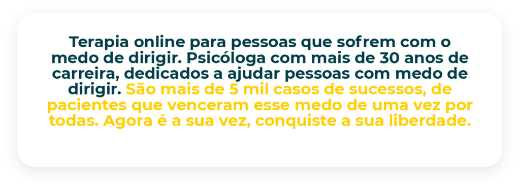 Cecilia Bellina é uma psicóloga com especialização em Psicologia Comportamental e Psicologia do Trânsito pela USP, além de ter Aprimoramento em Terapia Comportamental pelo Hospital das Clínicas. Ela também é formada como instrutora e diretora de autoescola e participou da revisão do último Código Nacional de Trânsito, além de ter sido Conselheira do DETRAN. Cecilia é autora do livro “Dirigir sem medo” e já palestrou em diversos eventos, como o Fórum Nacional de Trânsito, o VI Congresso Brasileiro de Psicologia do Trânsito e o IX Encontro de Medicina e Psicoterapia Comportamental, entre outros. Ela também participou de vários programas de TV e jornais, como o Fantástico, Jornal Nacional, Jô Soares, Auto Esporte, É de casa, Encontro com Fátima, Mais Você, revista Veja, Jornal O Globo, entre outros. Cecilia é pioneira no trabalho de psicologia especializada em Medo de Dirigir, com mais de 30 anos de experiência na área, e criadora do método Cecilia Bellina, que já ajudou mais de 5 mil pessoas a vencerem o medo de dirigir.